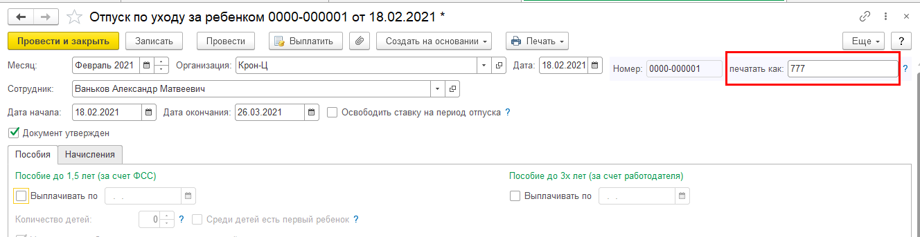 В отпуск по уходу за ребенком добавлено отдельное поле для номера приказа, выводимого на печать. По аналогии с ранее добавленным в кадровые приказы: