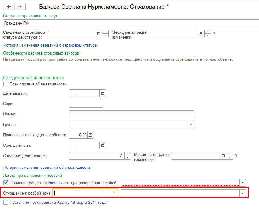 4) Реализована возможность указывать отношение к особой зоне в разделе "Страхование" карточки сотрудника.