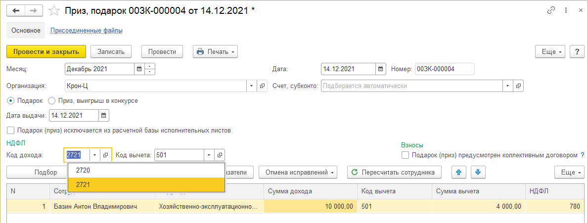 В документе "Приз, подарок" можно выбрать код 2720 или 2721.