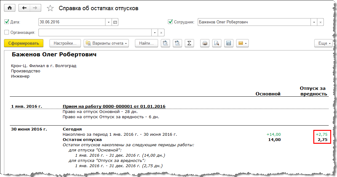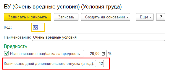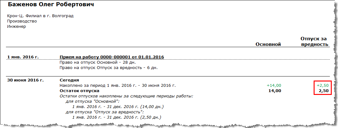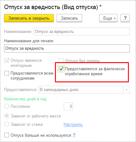 тогда за это время отпуск за вредность полагаться уже не будет (если в карточке вида отпуска был установлен новый флажок), и сотрудник заработает только 2,5 дня такого отпуска.