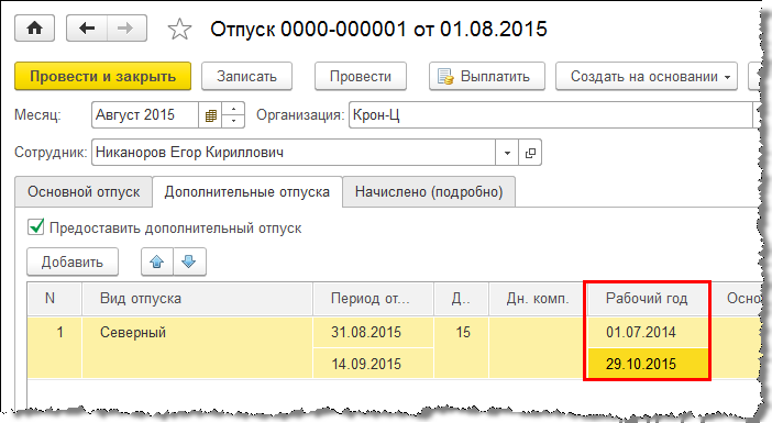 В версии 3.1.2 рабочий период, за который полагается северный отпуск, определяется как 01.07.2014 – 30.06.2015.