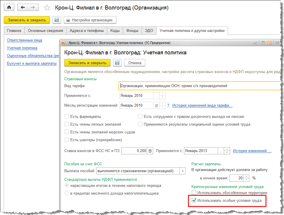 Далее предположим, что в организации ведется учет работы в особых условиях труда.