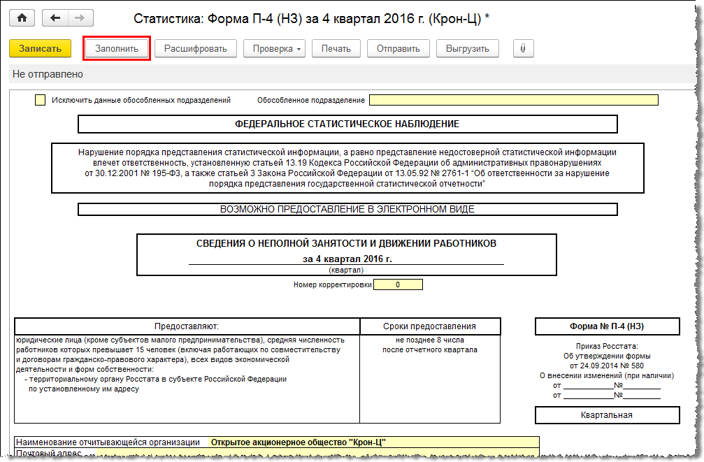 В версии 3.1.2 реализовано автоматическое заполнение формы П-4 (НЗ).
