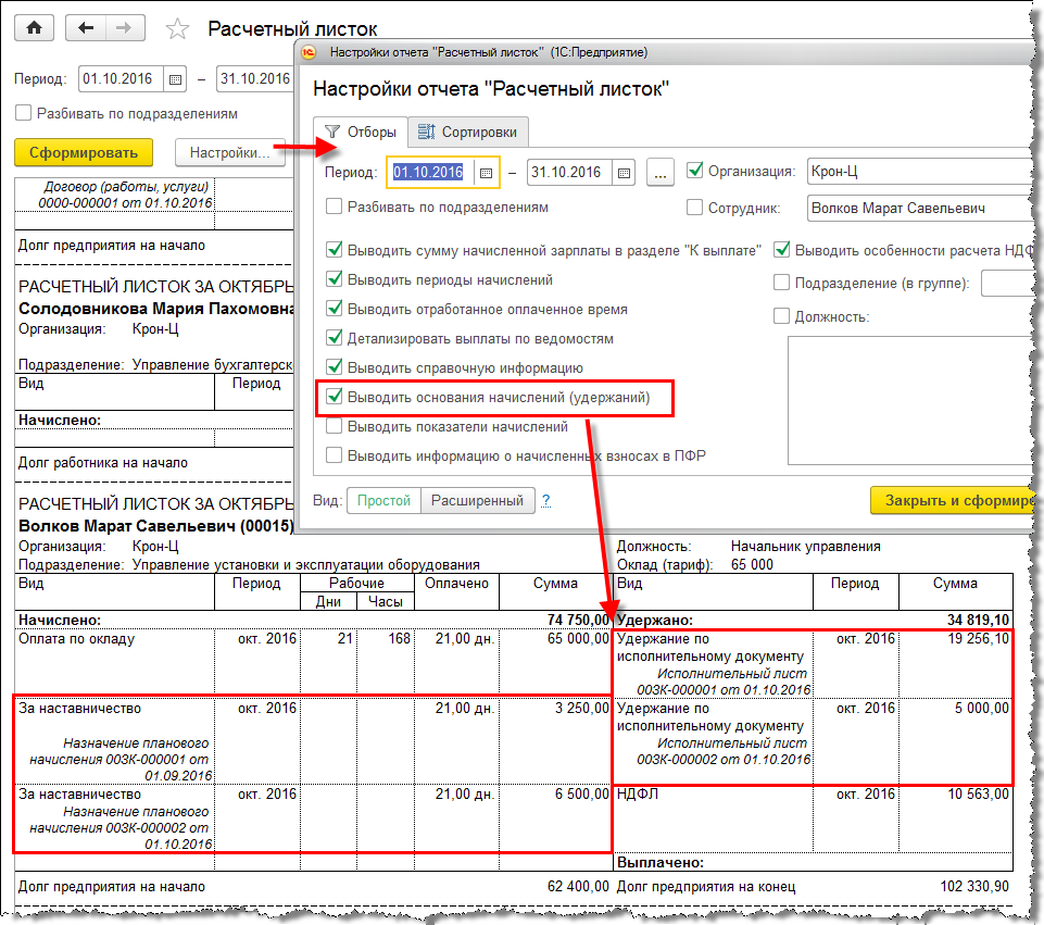 В расчетный листок добавлена новая настройка – "Выводить основания начислений (удержаний)". Если она установлена, то в листок не только выводятся реквизиты соответствующего документа, но и производится разбивка строк, если начисление или удержание выполнено по разным основаниям.