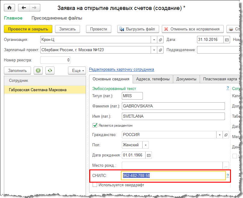 Теперь, если в карточке зарплатного проекта указан формат версии 3.5, в заявке на открытие лицевых счетов появляется поле для указания СНИЛС сотрудника.