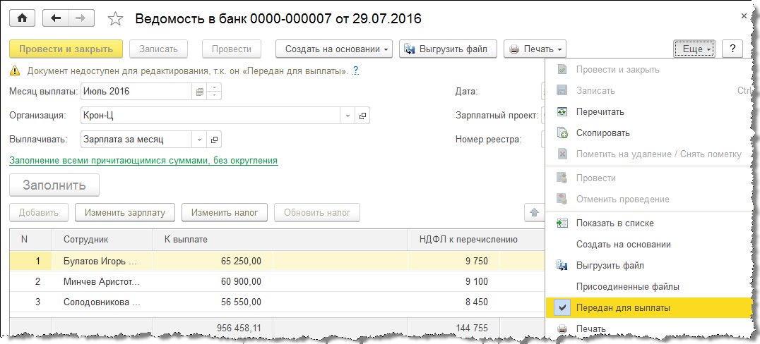 Теперь в меню "Еще" после проведения документа появляется пункт "Передан для выплаты". После нажатия на него документ становится недоступен для редактирования.