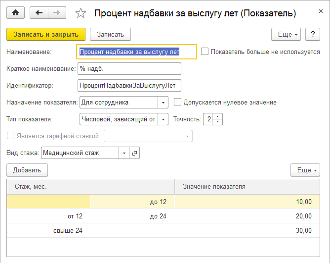 Например, в организации применяется следующая шкала для расчета надбавки за выслугу лет.