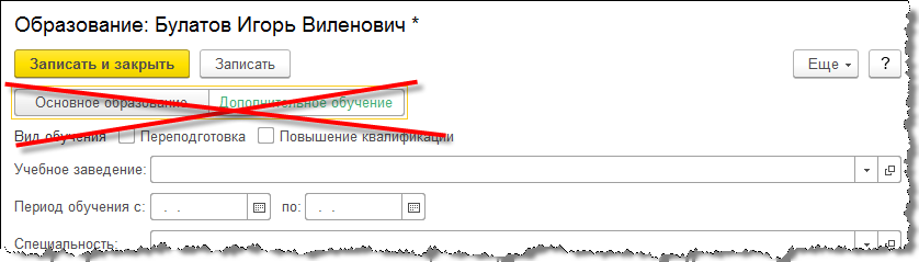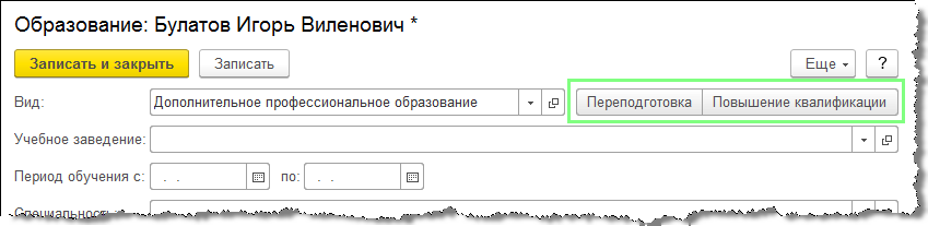 Во-первых, удален избыточный переключатель "Основное образование" и "Дополнительное обучение". Теперь достаточно указать вид образования "Дополнительное профессиональное образование", и после этого появляется переключатель для выбора вида профессиональной подготовки ("Переподготовка" или "Повышение квалификации").
