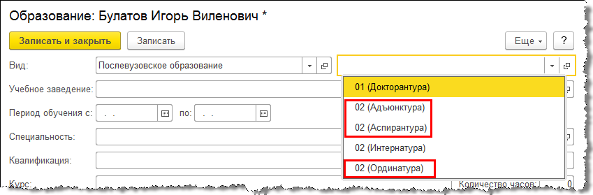Наконец, вид образования "Аспирантура, ординатура, адъюнктура" разбит на три разных вида.