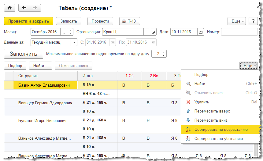 По умолчанию при заполнении табеля сотрудники в нем сортируются согласно настройкам, установленным в разделе "Настройка – Дополнительные настройки" (подробнее).