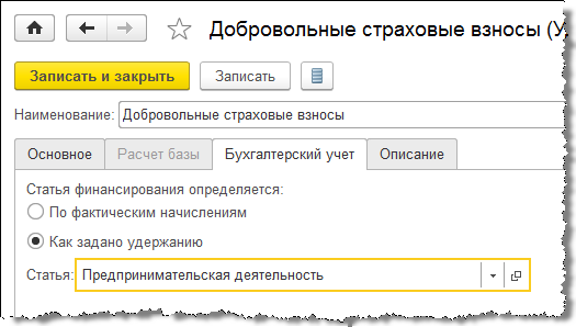 Но часто бывают ситуации, когда удержание, не имеющее расчетной базы, должно отражаться в бухучете по одной статье финансирования. В связи с этим для удержаний добавлена возможность указать способ отражения в бухгалтерском учете: "по фактическим начислениям" или "как задано удержанию".