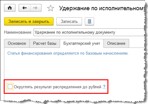 Также для удержаний, рассчитываемых по базе начислений, или удержаний, для которых статья финансирования определяется по фактическим начислениям, можно указать порядок округления результата распределения до рублей. Округление результатов распределения будет полезно для тех удержаний, в формуле которых есть округление результата расчета.