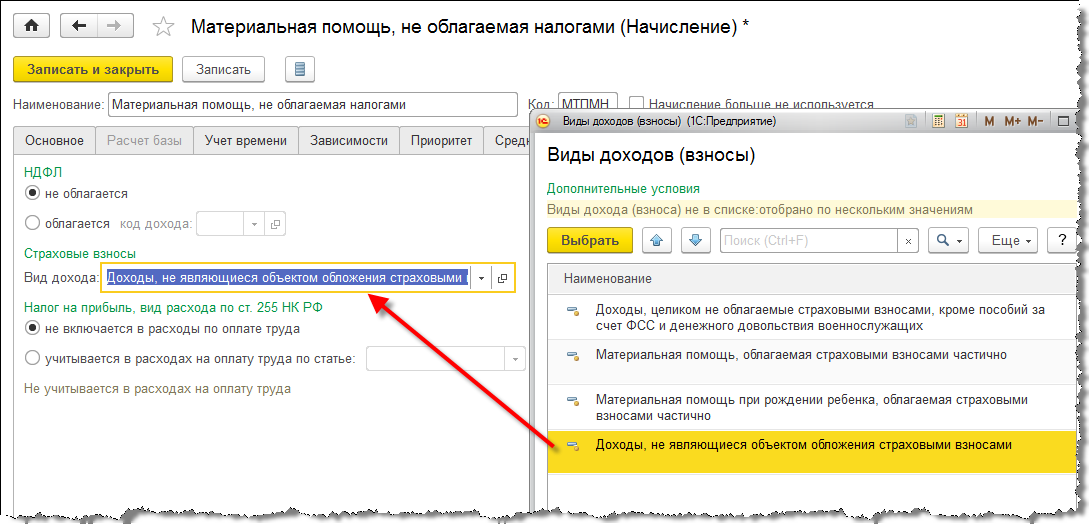По просьбам пользователей, в связи с Постановлением Президиума ВАС РФ № 17744/12 от 14.05.2013, для начисления с назначением "Материальная помощь" добавлена возможность указать вид дохода по страховым взносам "Доходы, не являющиеся объектом обложения страховыми взносами".