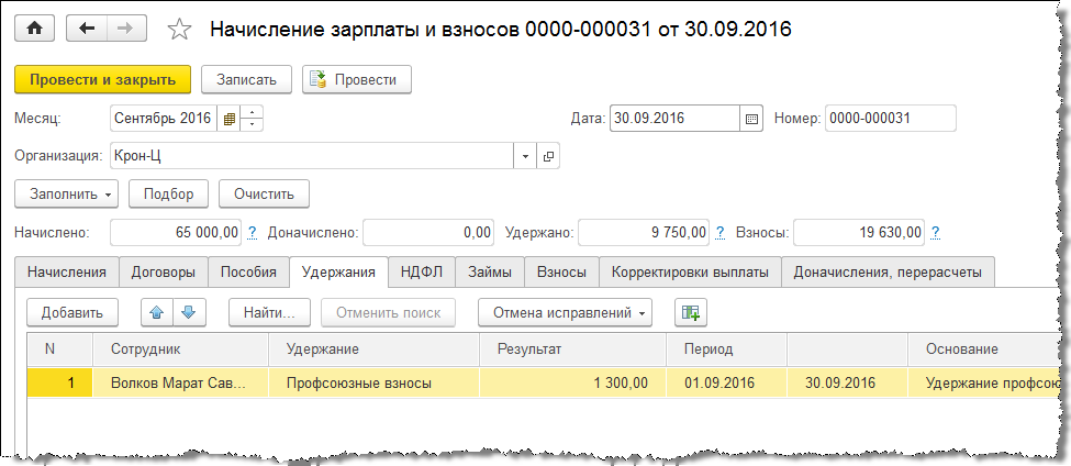 При расчете зарплаты за сентябрь сумма начислений составила 65 000 ₽, соответственно, удержалась сумма 1 300 ₽.