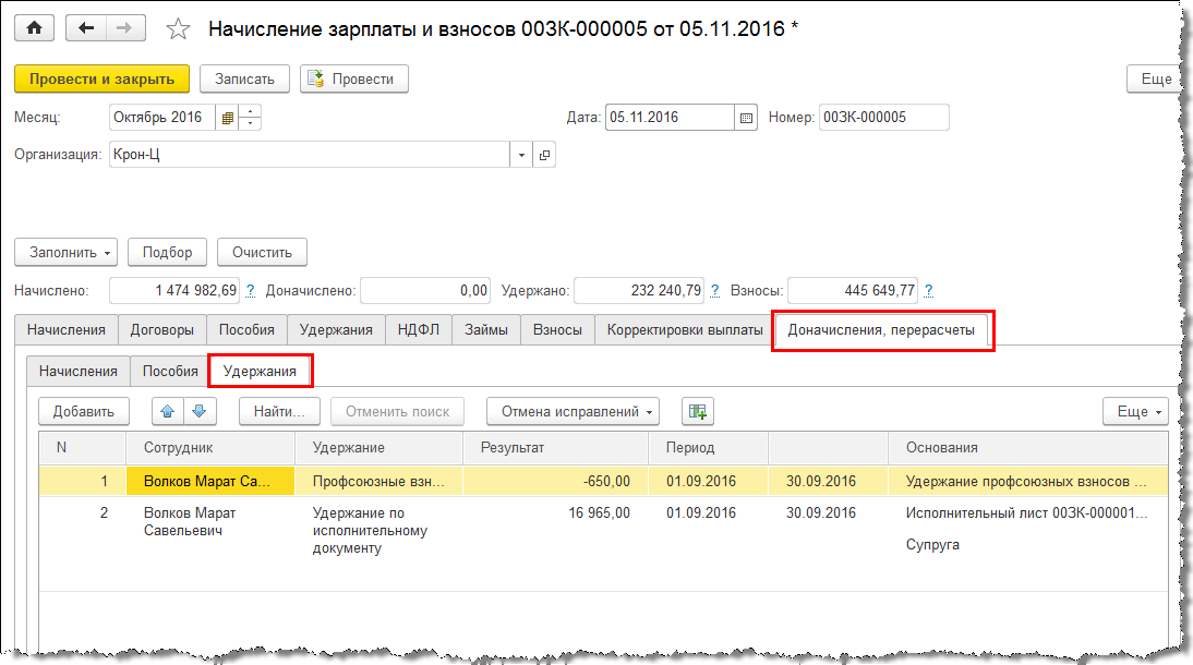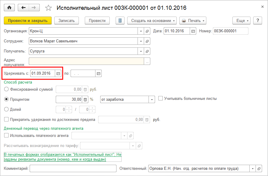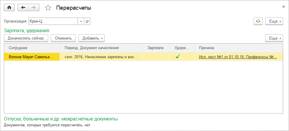 Кроме того, оказалось, что этому же сотруднику забыли ввести исполнительный лист, удержания по которому следовало выполнять с 01.09.2016. Пропущенный документ вводят также уже после начисления сентябрьской зарплаты.