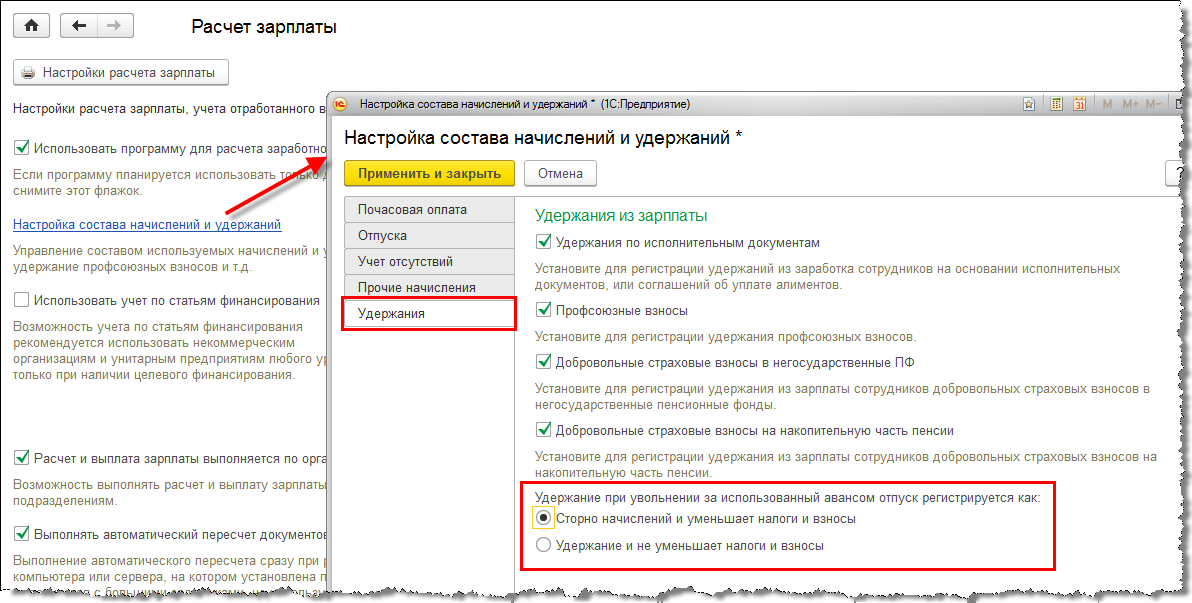 В версии 3.1.2 реализована поддержка этой точки зрения. Для ее задействования необходимо в настройках состава начислений и удержаний указать, что удержание при увольнении за использованный авансом отпуск регистрируется как сторно начислений и уменьшает налоги и взносы.