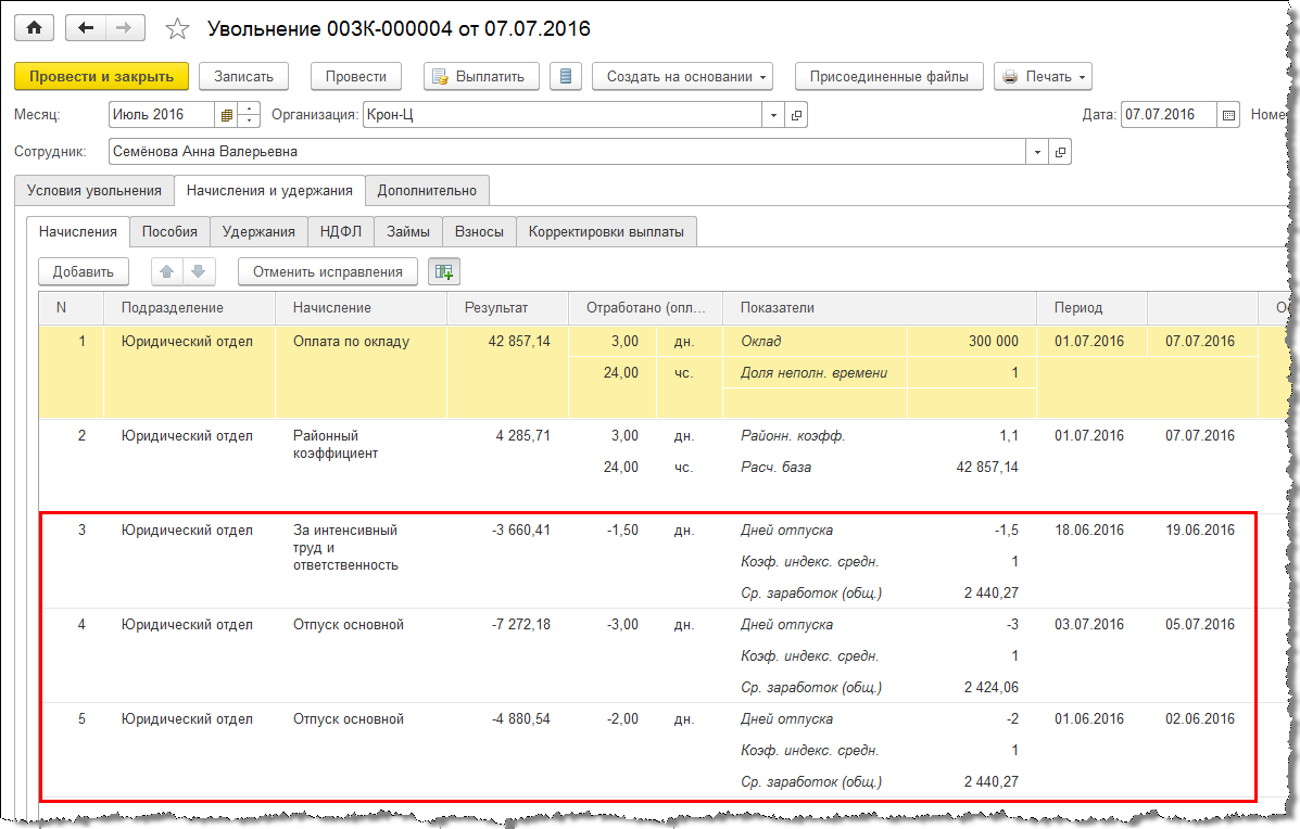 После чего сотрудник 7 июля увольняется. Перерасход отпуска составил 5 дней основного и 1,5 дня дополнительного.