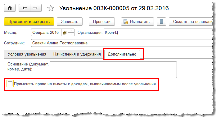 Если вычеты не требуется прекращать, то в документе можно установить новый флажок "Применять право на вычеты к доходам, выплачиваемым после увольнения" на закладке "Дополнительно".