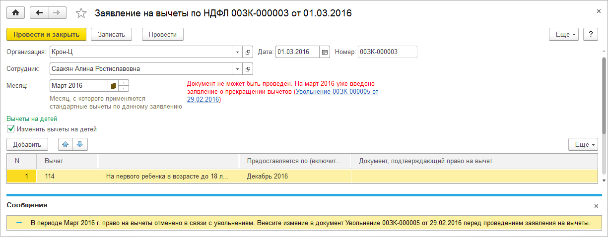 В версии 3.1.2 при увольнении сотрудника автоматически прекращается право на действующие стандартные вычеты. Вводить документ "Отмена стандартных вычетов НДФЛ" не требуется.