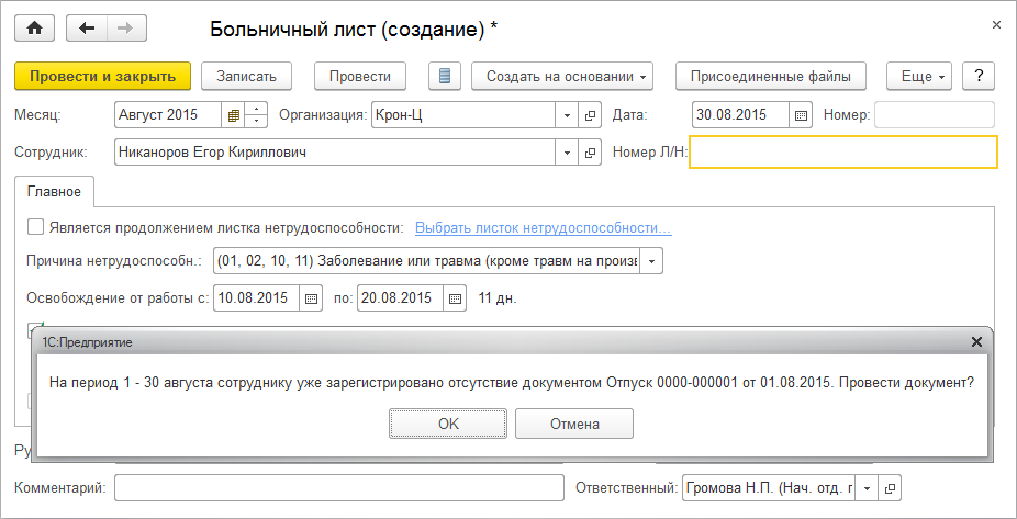Кроме того, реализовано предупреждение при регистрации на один и тот же период отсутствий разных видов. Например, при вводе больничного в период отпуска теперь будет выдано сообщение, в ответ на которое можно выбрать, проводить документ или нет.
