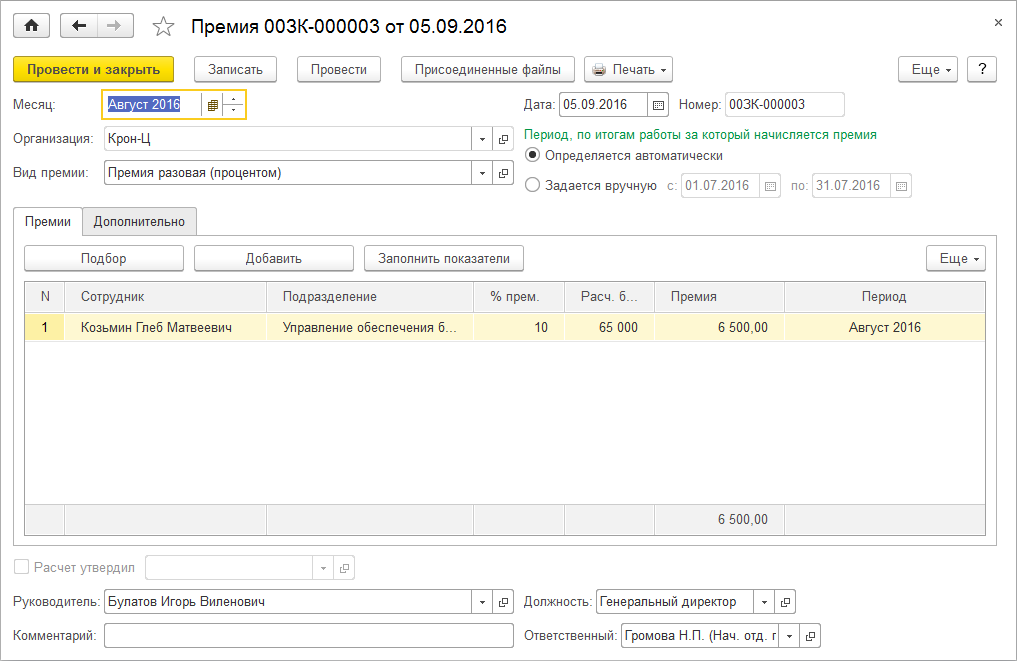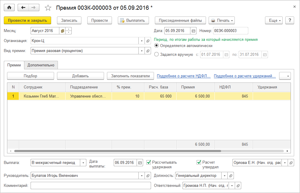 В случае, когда в программе работают пользователи с профилями "Кадровик" и "Расчетчик", предполагался следующий порядок работы с документом "Премия":