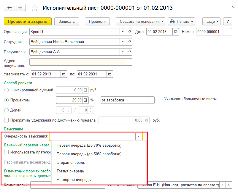 Колонка "Результат" заполняется в документе с учетом заданной для исполнительных листов очередностью, в соответствии с законодательством. После проведения документа именно суммы из этой колонки становятся фактически удержанными у сотрудника, а всё, на что зарплаты уже не хватило – откладывается в задолженность на следующие периоды. "Результат" автоматически определяется следующим образом: