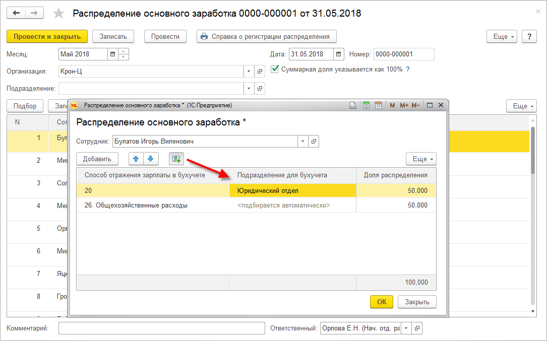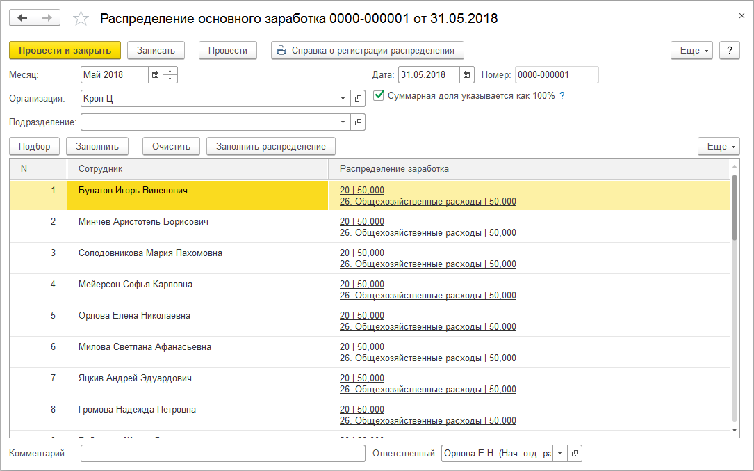 Если установить флажок "Суммарная доля указывается как 100%", то программа проверит заданное каждому сотруднику распределение, и в случае отличия суммарной доли от 100% выдаст ошибку.