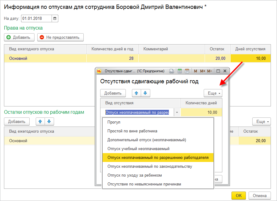 При вводе остатков отпусков при начале эксплуатации программы добавлена возможность указать количество дней отсутствия, которые влияют на сдвиг рабочего года сотрудника. Например, сотрудник брал отпуск за свой на 10 дней счет в декабре, на 1 января введены остатки по отпускам, в январе сотрудник берет еще 5 дней за свой счет – рабочий год в этом случае должен сдвинуться на 1 день.