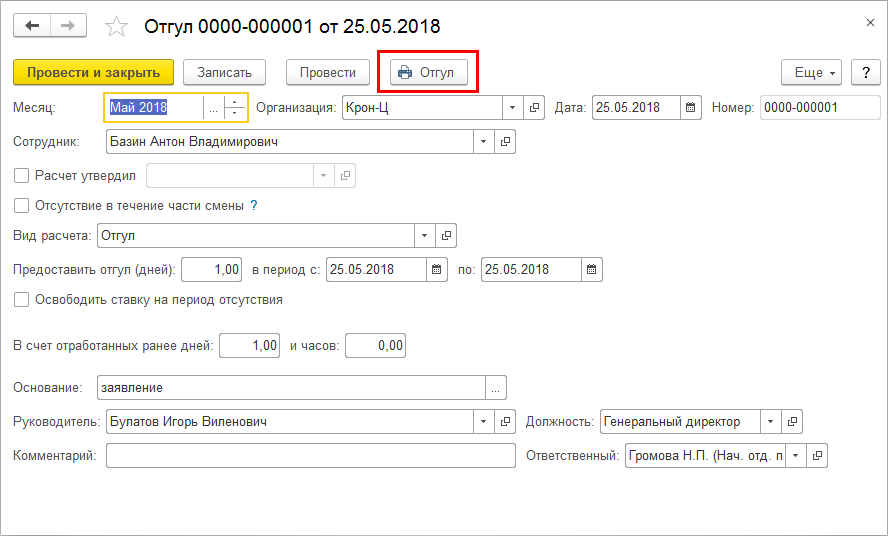 В документах "Отгул" и "Отгул списком" появилась возможность сформировать печатную форму приказа на отгул. Также добавлено новое поле "Основание" для вывода в печатную форму. Основание можно выбирать из пополняемого перечня.