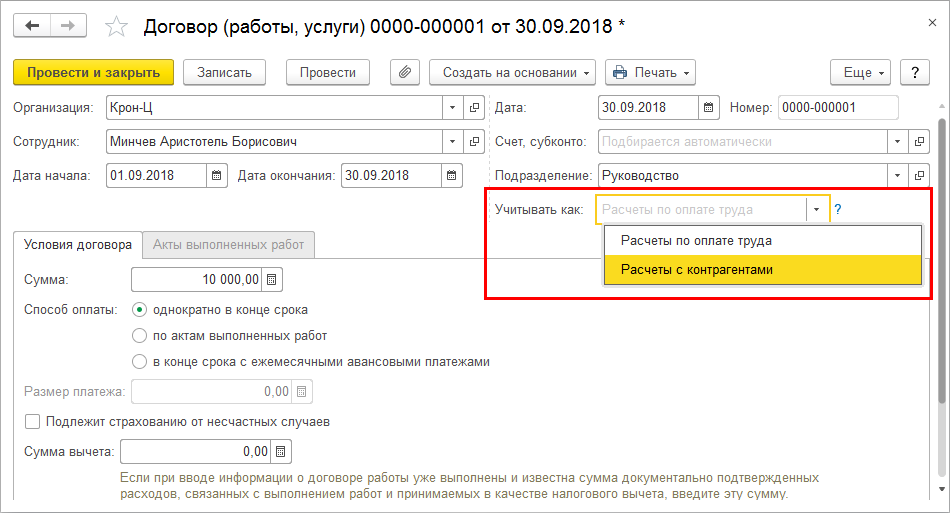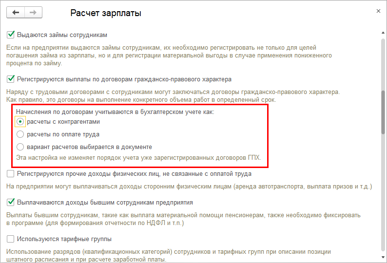 Она влияет на заполнение нового поля "Учитывать как" в договорах ГПХ – документах "Договор (работы, услуги)" и "Договор авторского заказа".