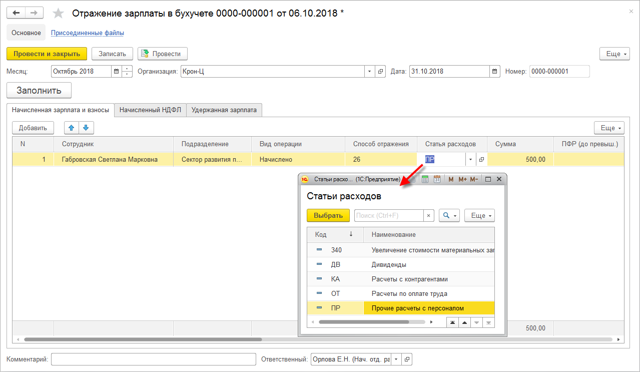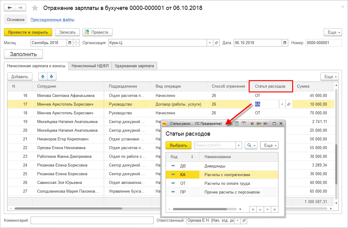 В свою очередь, заполнение этого поля в договоре влияет на заполнение новой колонки "Статья расходов" в документе отражения зарплаты в бухучете.