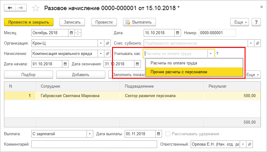 Теперь в документах "Материальная помощь", "Компенсация за задержку зарплаты" и "Разовое начисление" (при выборе в нём начисления с назначением "Компенсационные выплаты" или "Компенсация морального вреда") также доступно новое поле "Учитывать как".