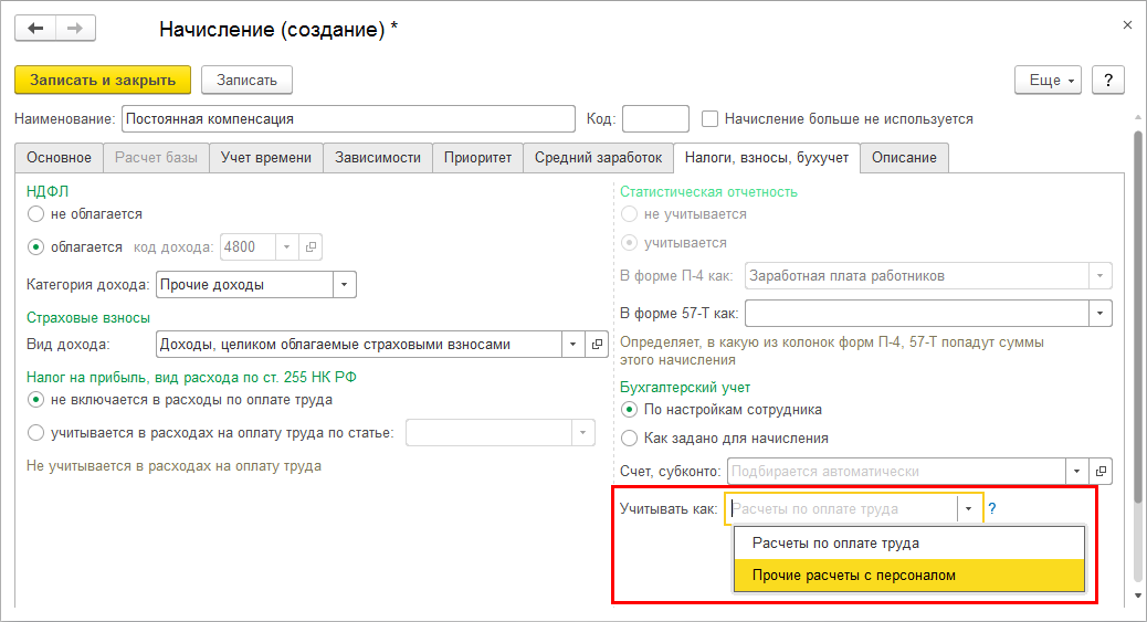 Если указать "Прочие расчеты с персоналом", то при заполнении отражения в бухучете по таким начислениям статья расходов будет указана соответствующая.