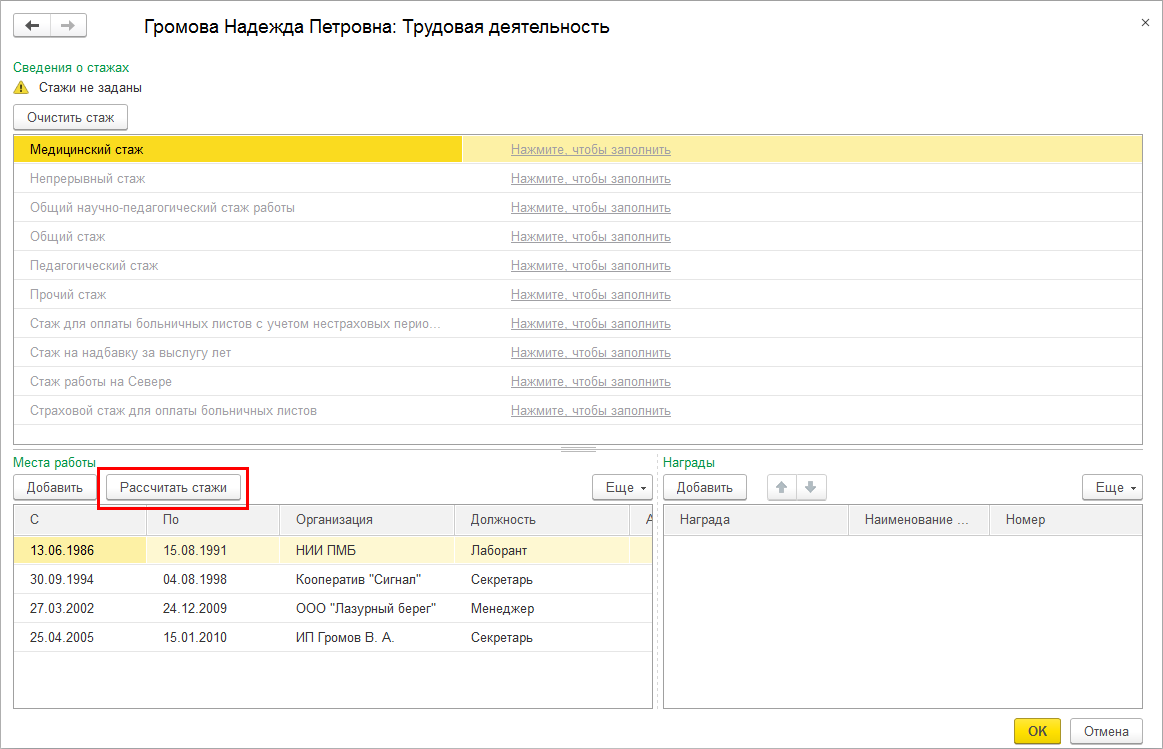 Реализована возможность автоматического расчета стажей сотрудника согласно сведениям об его прошлой трудовой деятельности. Калькулятор открывать по кнопке "Рассчитать стажи" над таблицей с трудовой деятельностью.