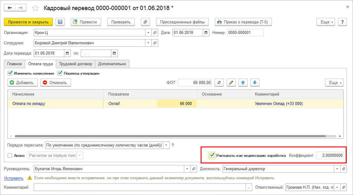В связи с этим в версии 3.1.9 реализована возможность в кадровых документах указать, что изменение ими начислений следует учитывать как индексацию заработка. Коэффициент индексации определяется как в документе "Изменение плановых начислений" – как отношение новой и старой совокупной ставки.