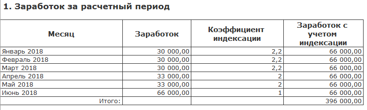 Например, сотрудник принят в январе с окладом 30 000. С апреля произведена индексация заработка на 10% (коэффициент 1.1) до 33 000. А с июня сотрудник переведен на должность с окладом 66 000.