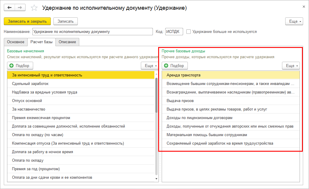 В связи с этим версии 3.1.9 добавлены возможность в удержании по исполнительному документу исключить виды прочих доходов или выплат бывшим сотрудникам из расчетной базы.
