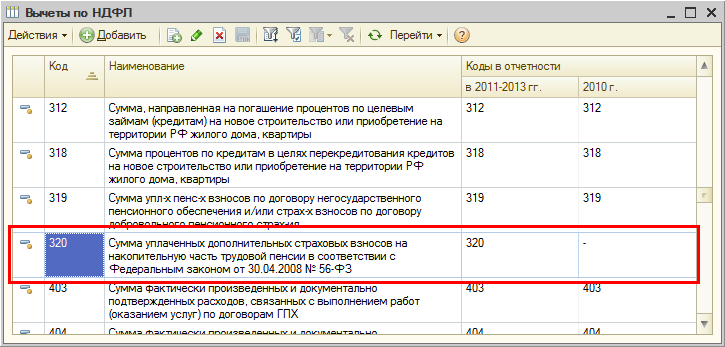 В версии 2.5.61 реализовано автоматическое предоставление указанного вычета при расчете НДФЛ в документе "Начисление зарплаты сотрудникам организаций", а также отражение его в отчетности. В справочник "Вычеты по НДФЛ" добавлен элемент для регистрации нового вычета, которому присвоен код 320; после внесения изменений в Приказ ФНС РФ от 17.11.2010 № ММВ-7-3/611@, утверждающий справочник "Коды вычетов", этот код будет уточнен.