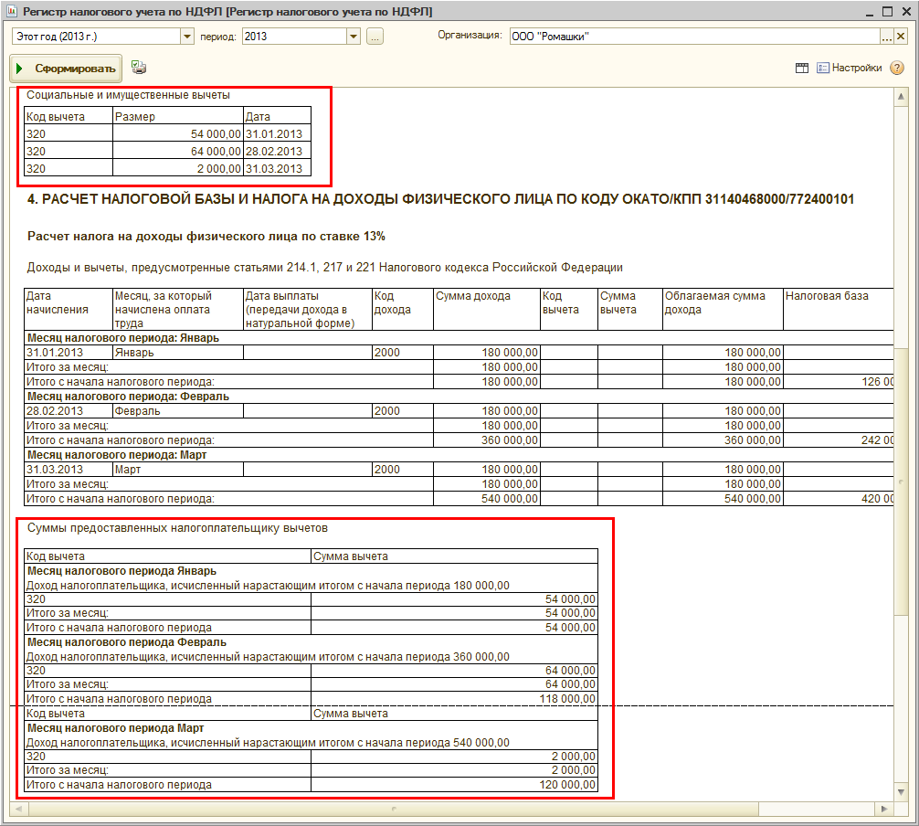 В марте 2013 года сумма начислений составила, как и ранее, 180 000 руб., сумма удержания добровольных взносов – 54 000 руб. (разовых удержаний не регистрировалось). Социальный вычет теперь будет зарегистрирован в сумме 2 000 руб., поскольку ранее в течение года он уже был зарегистрирован в размере 118 000 руб., а абзацем третьим п. 2 ст. 219 НК РФ предусмотрено ограничение суммы вычета суммой 120 000 руб. в налоговом периоде.