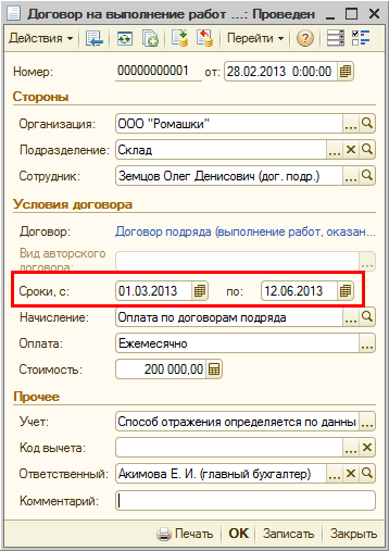 Если по какой-то причине у этого начисления (перед его выполнением) будет установлен вид дохода, например, "Доходы, целиком облагаемые страховыми взносами", то сведения о соответствующих суммах и взносах попадут в пачку с типом договора "ТРУДОВОЙ", а в пачку с типом "ГРАЖДАНСКО-ПРАВОВОЙ" попадет только стаж сотрудника в соответствии со сроками, указанными в договоре (документе программы).