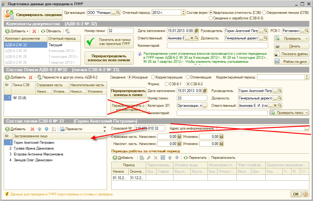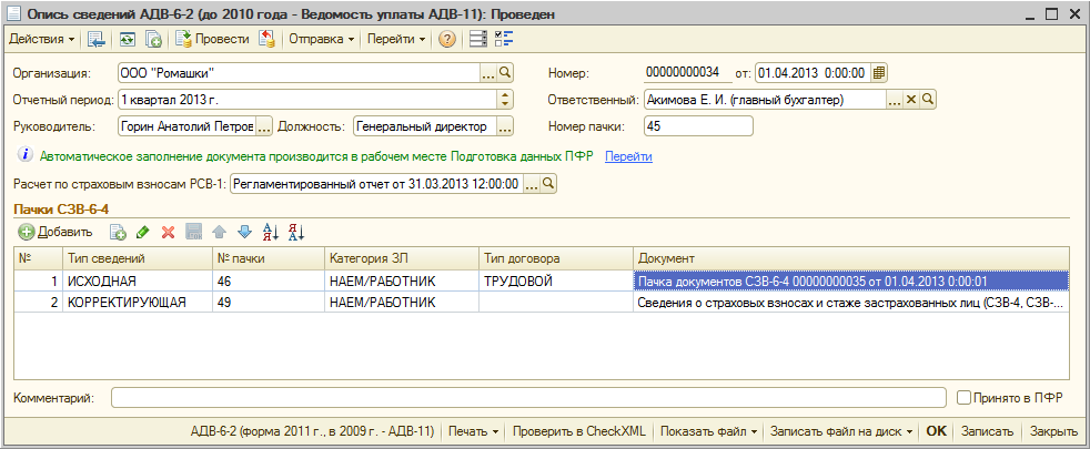 Автоматическое формирование и заполнение документов СЗВ-6-4 и соответствующей описи АДВ-6-2, а также формирование всех печатных форм и файлов предполагается осуществлять из рабочего места подготовки данных для ПФР.