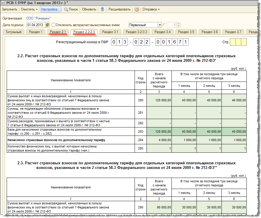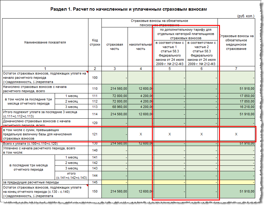 Сведения о суммах выплат, облагаемых дополнительными взносами, заполняются без каких-либо особенностей. Они определяются по тем доходам, которые в программе были отмечены (автоматически или вручную) как облагаемые такими взносами. Напоминаем, что база для дополнительных взносов не ограничивается предельной величиной.