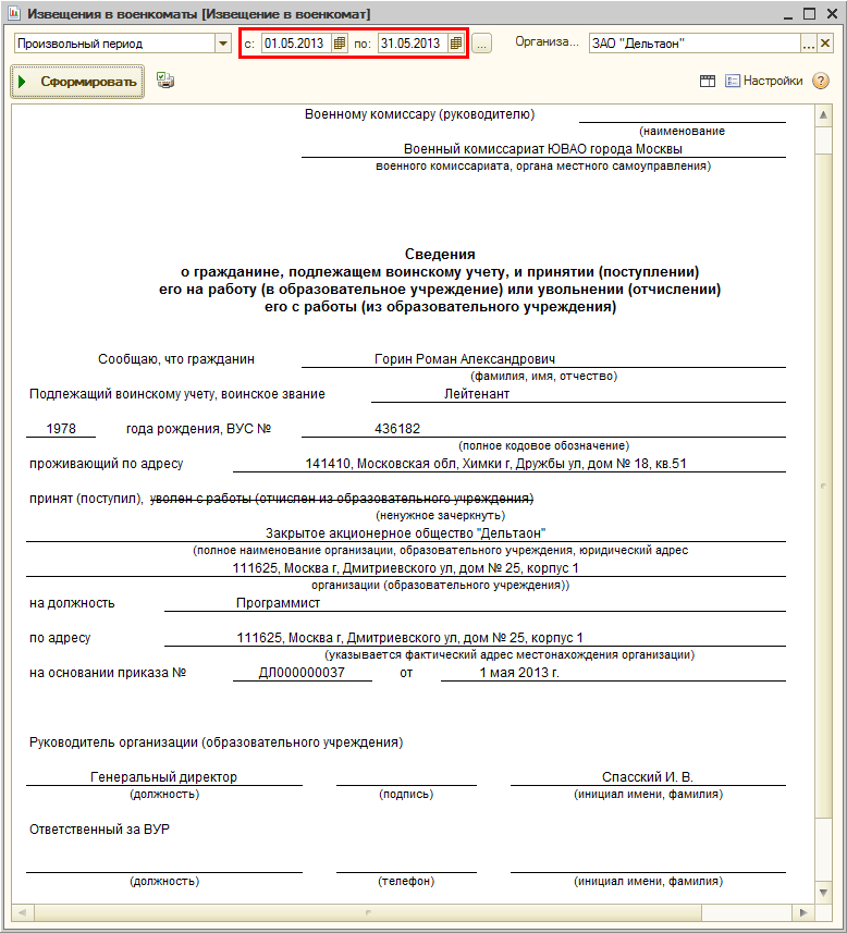 Отчет автоматически заполняется военнообязанными сотрудниками, не снятыми с воинского учета, работающими в организации на основном месте работы.