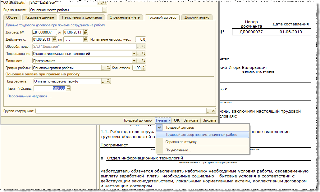 В связи с внесением Федеральным законом от 05.04.2013 № 60-ФЗ изменений в Трудовой кодекс Российской Федерации, связанных с особенностями регулирования труда дистанционных работников, в версии 2.5.67 реализована примерная печатная форма трудового договора с такой категорией работников. Форма доступна из карточки сотрудника.