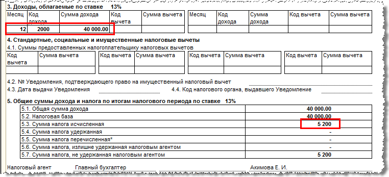 Например, сотрудник принят в декабре 2012 г. на оклад 40 000 руб. и в декабре начислено 40 000 руб., исчислен НДФЛ 5 200 руб.