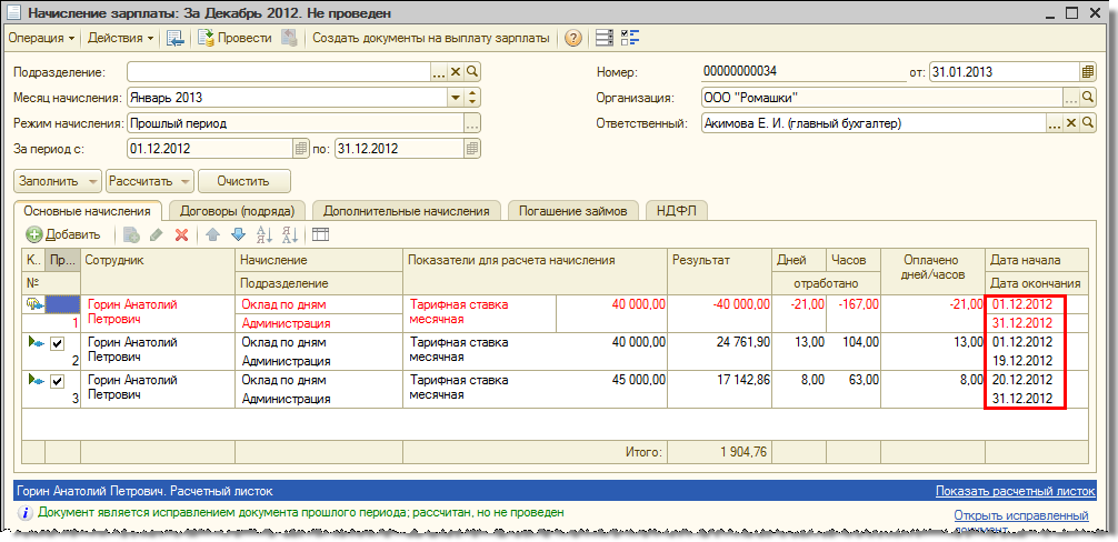 В январе 2013 проводится перерасчет зарплаты в связи с изменением оклада с 20.12.2012 на 45 000 руб.