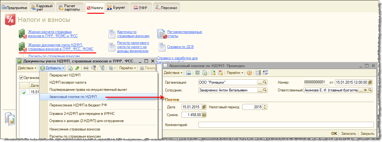 Для поддержки этого изменения в версии 2.5.87 реализован документ «Авансовый платеж по НДФЛ», котором следует регистрировать сумму авансового платежа перед исчислением налога.