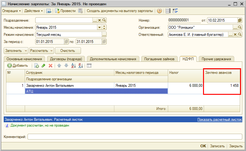 Обращаем внимание, что в аналитически отчетах, а также при отражении зарплаты в бухгалтерском учете, зачтенная сумма отдельно не показывается.