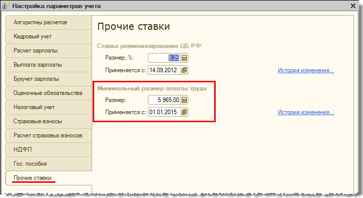 В соответствии с Федеральным законом от 1 декабря 2014 года № 408-ФЗ с 1 января 2015 года установлен минимальный размер оплаты труда (МРОТ) в сумме 5 965 руб. в месяц. Напомним, что эта величина в программе используется исключительно для расчета пособий. Если используются начисления с произвольными формулами, в которых фигурирует собственный показатель МРОТ (например, «Доплата до МРОТ»), то новое значение показателя при необходимости следует ввести самостоятельно.