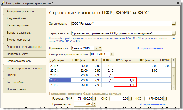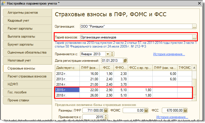 Основное изменение в тарифах страховых взносов с 2015 года уже было предусмотрено законодательством и ранее, и, соответственно, было реализовано и до версии 2.5.87.